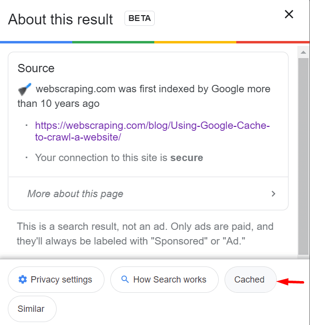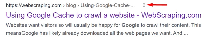 To accomplish this, go to the Google search engine and type the word or the name of the website. From the results, take the page that you want to scrape. Click on the three dots near the title of the page, and you can see the button “Cached.” Then, click on it, and you can see the cached page immediately.