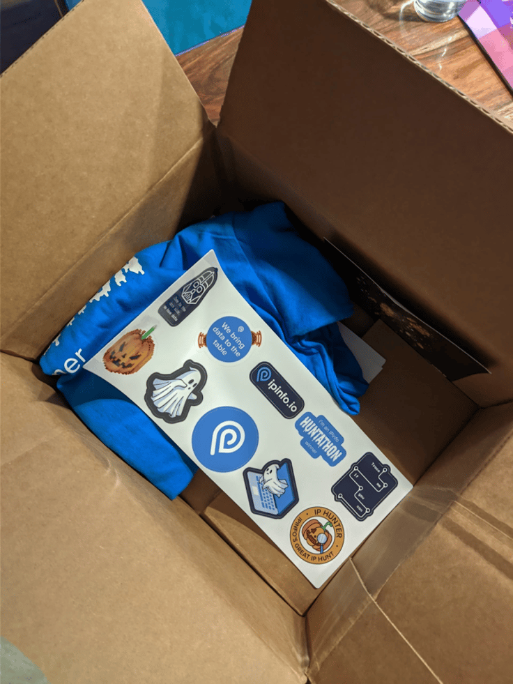 I got myself a sticker pack, an “I am a Huntathon Winner T-Shirt”, a Notecard with a map of the Internet, and some IPinfo socks.