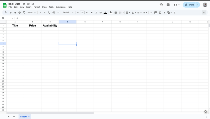 sheet.update("A1", [["Title", "Price", "Availability"]])
