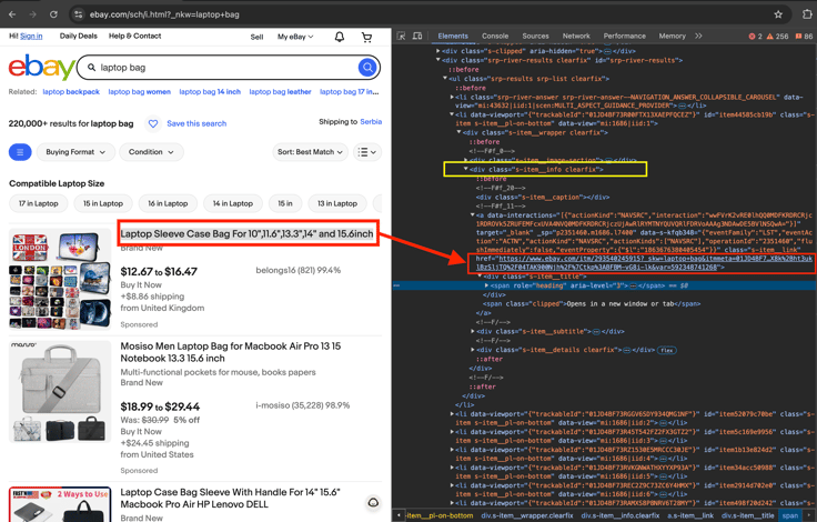 Let's begin by explaining the search process we'll use in this tutorial. We'll query the eBay URL with a “laptop bag” keyword, as shown in this picture: