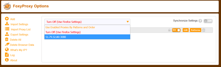 • Now, you can see the newly added proxy with buttons like On, Edit and Patterns. You can edit or make changes to the Proxy using the Edit button. You can also provide pattern details like URLs if needed.