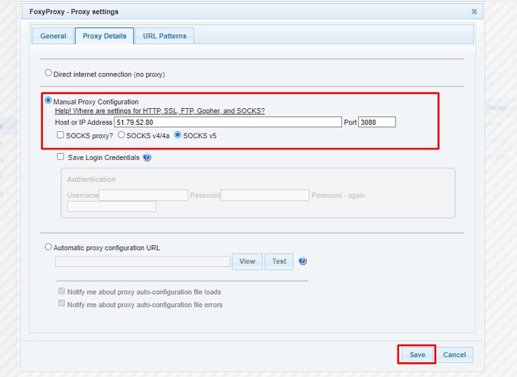 • Now fill in the manual configuration details by providing the IP address and port number. You can use any of the free proxies provided by ProxyScrape. Then select the Proxy type like SOCKS5 or SOCKS4.