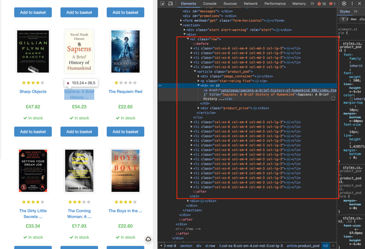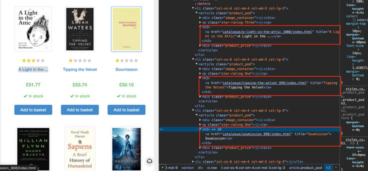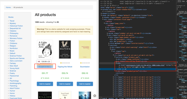 To demonstrate, we’ll use the same example website again. We'll focus on extracting the title text of a single book using the h3 tag nested inside an article element with the class product_pod.