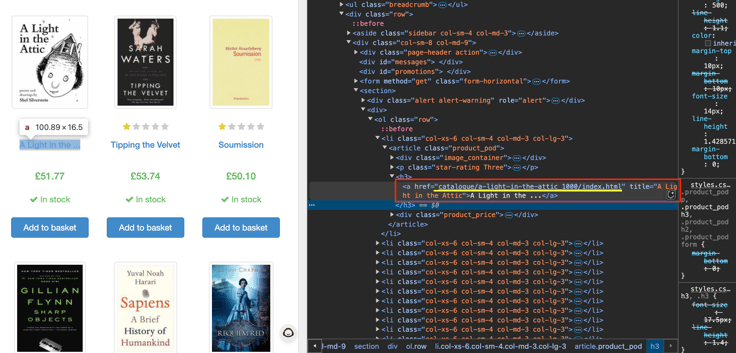 We'll focus on extracting the link (href) to a book's detail page from the <a> tag inside an article element with the class product_pod.