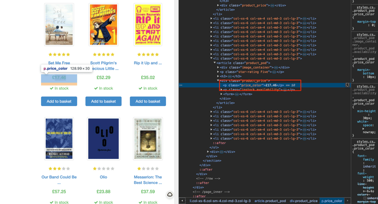 product_pod.div.product_price p.price_color, it navigates into the div and selects the p tag containing the price..get() method retrieves the price value.Price: £51.77