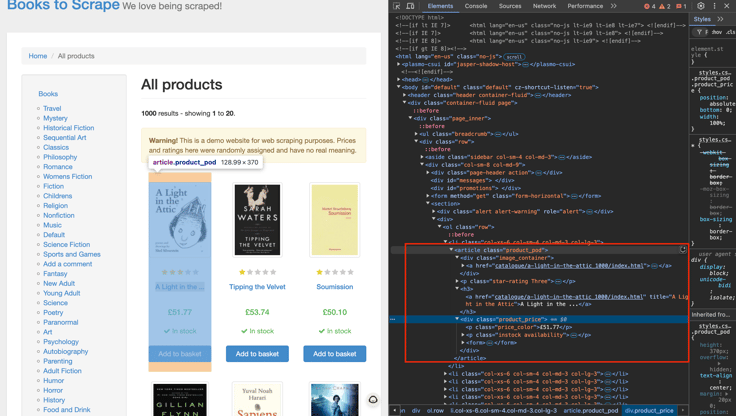 To demonstrate, we’ll use this example website. We’ll focus on extracting data from an element with the class name product_pod, which represents a single book entry.