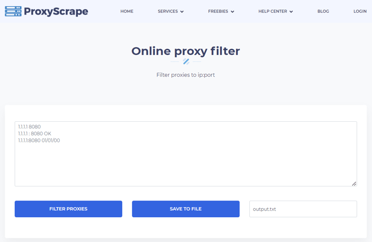 Most proxy providers offer this service online with the additional ability to save to a file and clear the field. Proxy filtering is performed in IP: PORT format. The other advantages of the filter are the following: