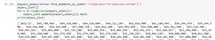 Explanation: The process is the same. The only difference is the common element among the players. The web element “td class-‘hh-salaries-sorted'” was the common element. After finding the element, we create an empty list to loop the whole function and append the salary details to the empty list. The output should look like the image shown below: