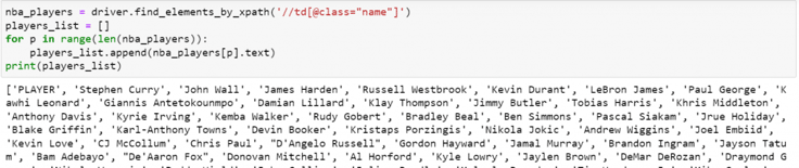 Explanation: As mentioned above, we are finding the HTML code element by using the XPATH approach. Obviously, we need the XPATH path of multiple elements. The easiest way is to find the name element, which is “td class-name.” Right-click on the element and select “Copy.” You should get many options, such as copy JS path and copy XPATH. Select copy XPATH, and you should automatically get the XPATH location of the element. Paste the path in the find_elements_by_XPATH argument. Once you paste the path, Python should start to identify these elements and get their addresses, not the actual name. To get the players’ actual names, we are going to loop the function and append the results to an empty list as an output. Once you execute the above code snippet, you should get the output as shown in the image below.