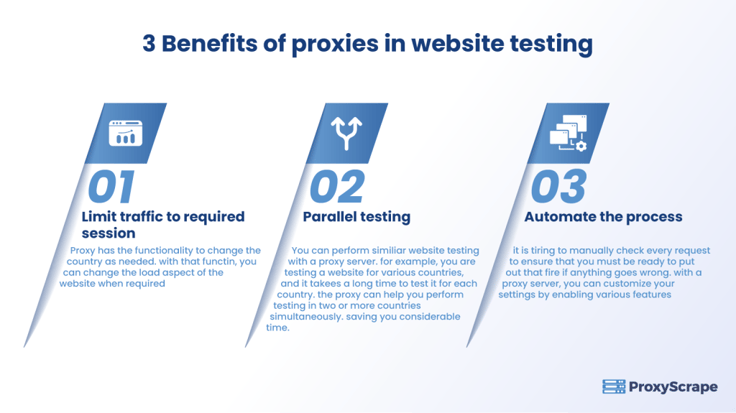 The main benefit of a proxy server in website testing is, localizing the web testing process. Apart from that, there are other benefits that you can see in website testing, such as: