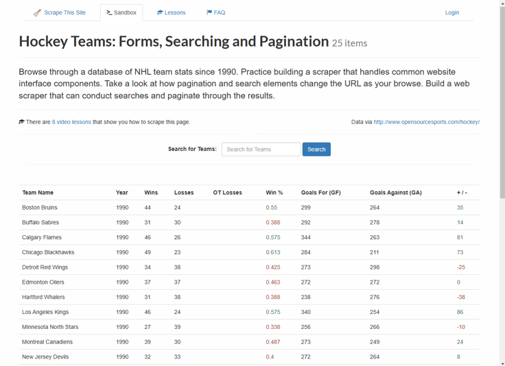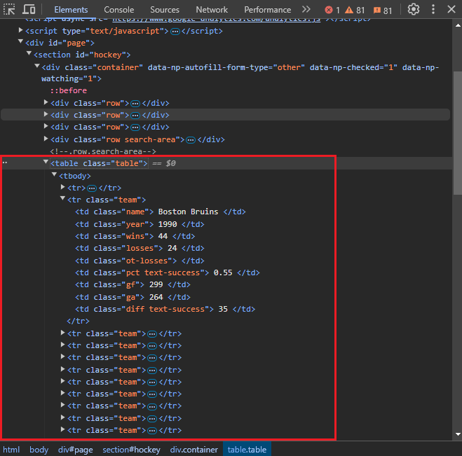 In this example, we’re using hierarchical selectors to scrape data from a table of hockey team statistics found on this webpage.