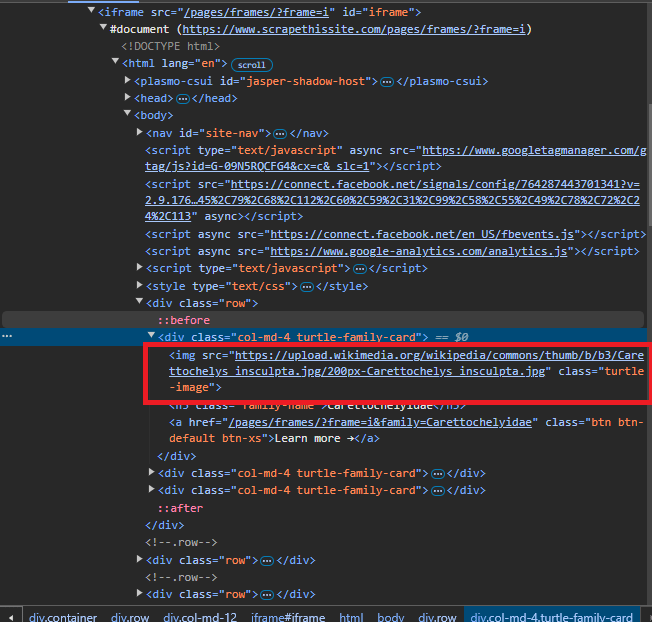 In the following example, we will select all images on the this webpage and extract their source URLs or src attributes. This is how the element looks in the html structure and webpage view: