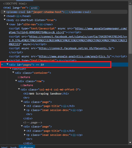soup.find("div", id="pages") to locate the <div> element with id="pages". <div> is found, we print its content. If not, a message indicates it’s missing.ID selectors are powerful but have limitations. Dynamic IDs that change with each page load can make consistent data extraction difficult. In these situations, using alternative selectors may be necessary for reliable results.