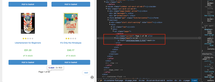 First, we’ll locate the button using its class attribute that has as value next . Within this element, there’s an <a> tag containing the URL for the next page. By extracting this URL, we can use it to send a new request and seamlessly move to the next page.Here is the appearance and HTML structure of the next button on the page.