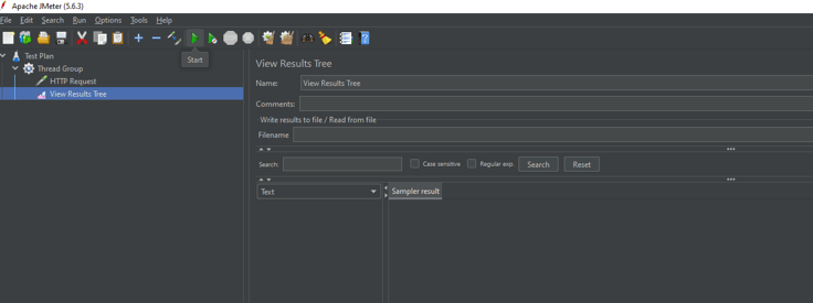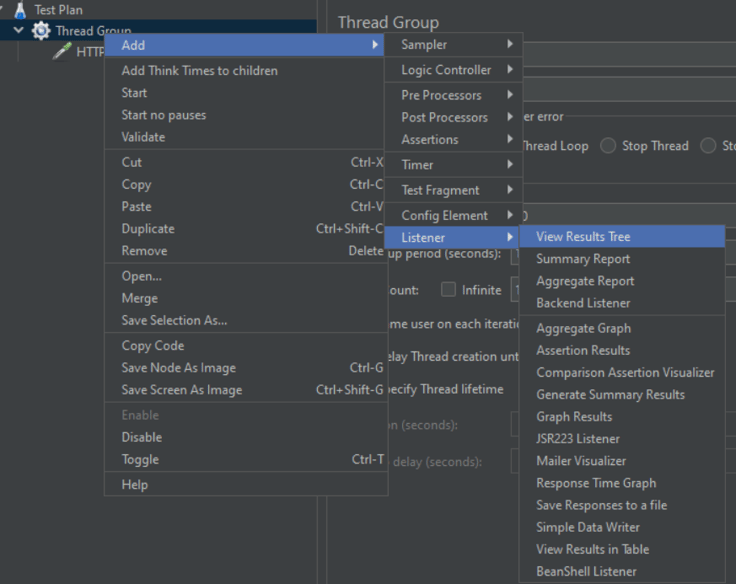 Now we are gonna add listeners. They are used to provide the test results. There are different type of listeners in JMeter and many more that can be installed using plugins. The listener that we will use here is the "View Results Tree" .