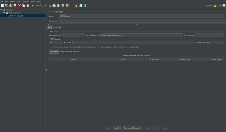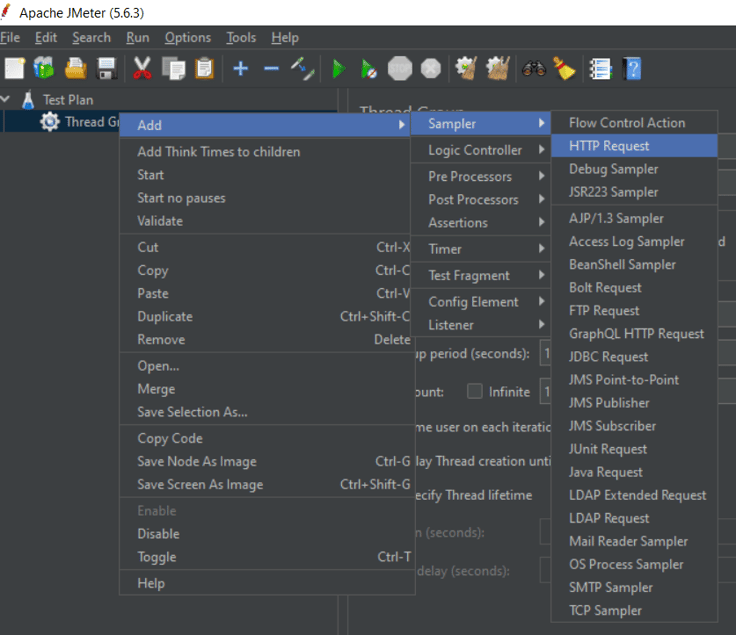Next, we will specify the HTTP request to make to our target test website. For this example, we used https://www.scrapethissite.com/.To do that right-click on Thread Group -> Add -> Sampler -> HTTP Request