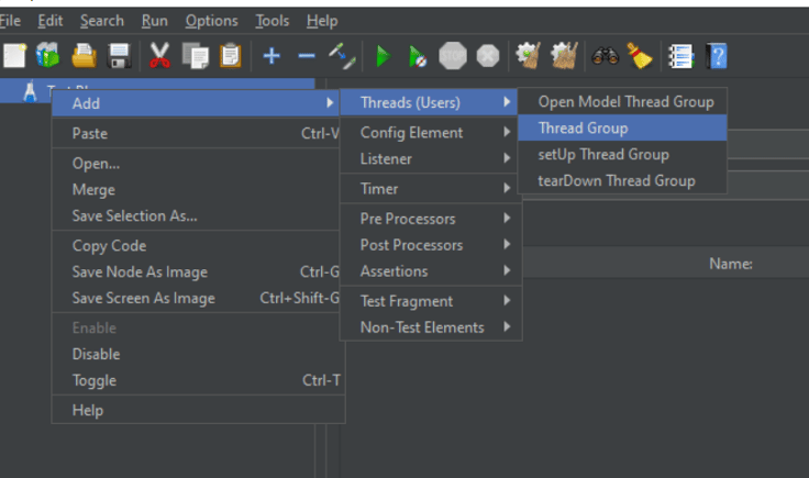 Next, we will add the Threads, or in simpler terms, the test users, and adjust some related settings.To do this double click on "Test Plan" element and go to "Add" then "Threads (Users)" and then to "Thread Group"