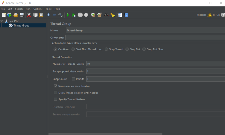 In this example, we will set the number of threads to 10, meaning the test will be conducted by 10 users. Ramp-up period (seconds) is the time between each user sending a request in this case we leave it as default to 1. Loop Count refers to the number of requests each thread/user will send. We will leave it at the default value of 1.There is also a scheduler available that you can use to send and end requests at specific times. However, for the sake of simplicity, we did not utilize it here.
